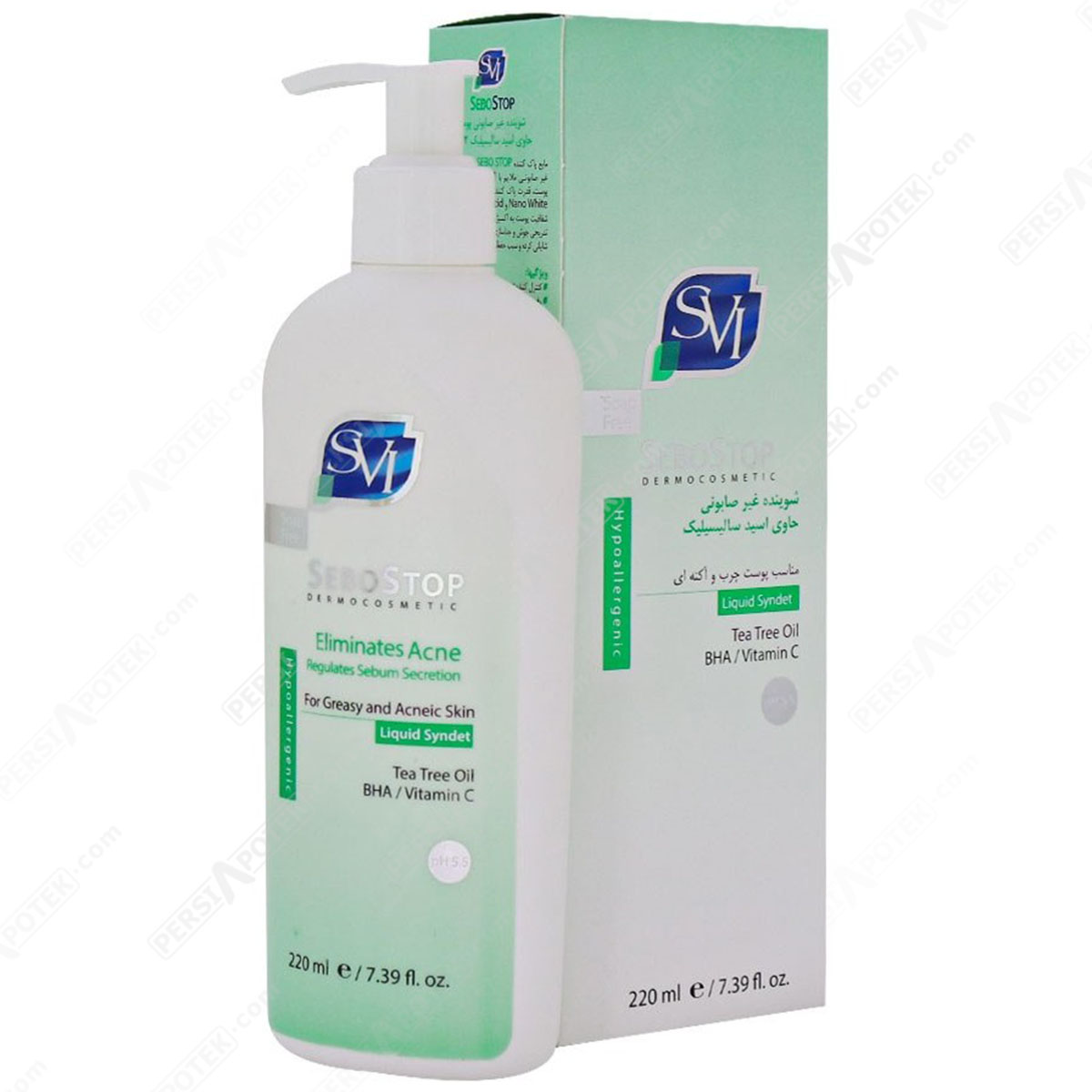 پن مایع غیرصابونی سبو استاپ اس وی آی محصولی از برند معتبر SVI است که فاقد مواد صابونی بوده و مناسب پوستهای چرب و آکنهای است. مایع پاککننده Sebo Stop با PH تنظیم شده و سازگار با پوست، قدرت پاککنندگی بالایی دارد. این شوینده حاوی Nano White و اسید سالیسیلیک بوده علاوه بر شفافیت پوست به اکسیژنرسانی مطلوب و از بین رفتن تدریجی جوش و جداسازی سلولهای مرده پوست کمک شایانی کرده و سبب حفظ شادابی و رطوبت پوست میشود. پوستهای چرب معمولا منافذ باز دارند که ممکن است ظاهری زیبا نداشته باشند. پن مایع سبو استاپ به جمع شدن این منافذ کمک کرده و ترشح چربی را در پوست، کنترل میکند. آکنه معمولا التهاب و قرمزی به وجود میآورد. با استفاده از این محصول میتوان این نوع التهابات را کاهش داد و همچنین دانههای سرسیاه را از روی پوست محو کرد. این شوینده غیرصابونی حاوی روغن درخت چای است.