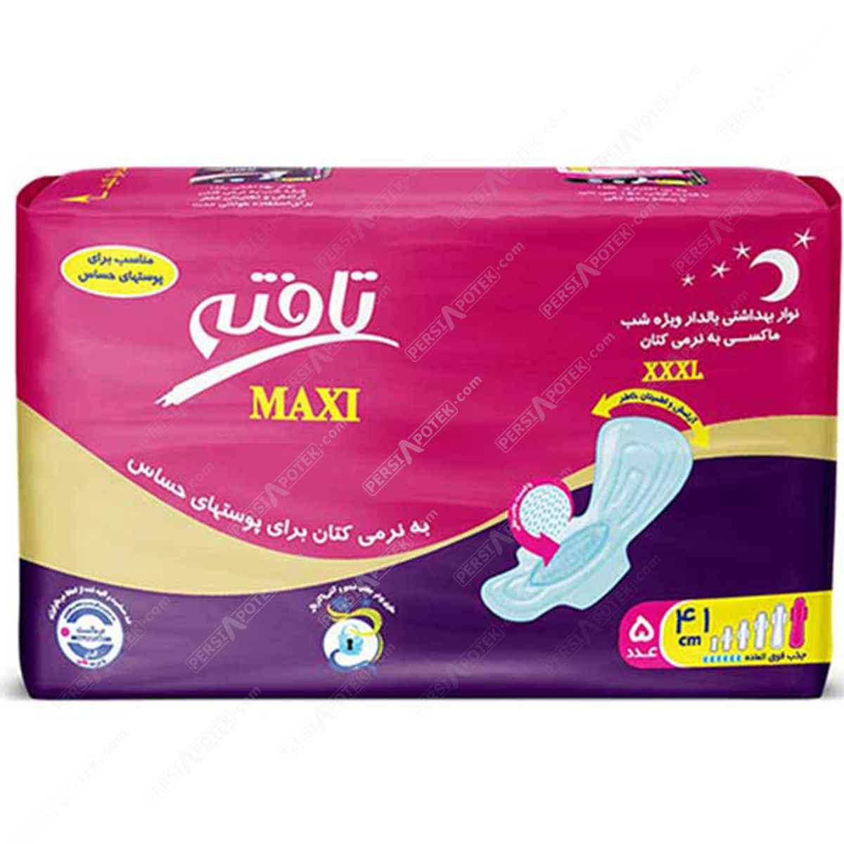 نوار بهداشتی بالدار تافته مدل Maxi با لایه رویی مشبک و قطر متوسط، راحتی و محافظت کامل را در طول شب تضمین میکند. طراحی بالدار این محصول، ثبات و امنیت بیشتری را فراهم کرده و از نشت جلوگیری میکند. این نوار بهداشتی فاقد مواد معطر است و به همین دلیل برای پوستهای حساس کاملاً مناسب است. بستهبندی 5 عددی آن، استفاده آسان و بهصرفه را برای شما فراهم میآورد. این محصول با قدرت جذب زیاد، آرامش و آسودگی خاطر را در طول شب به شما هدیه میدهد.