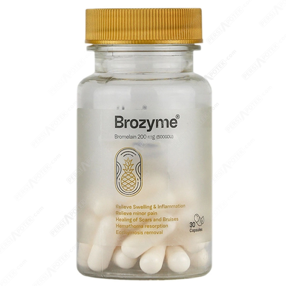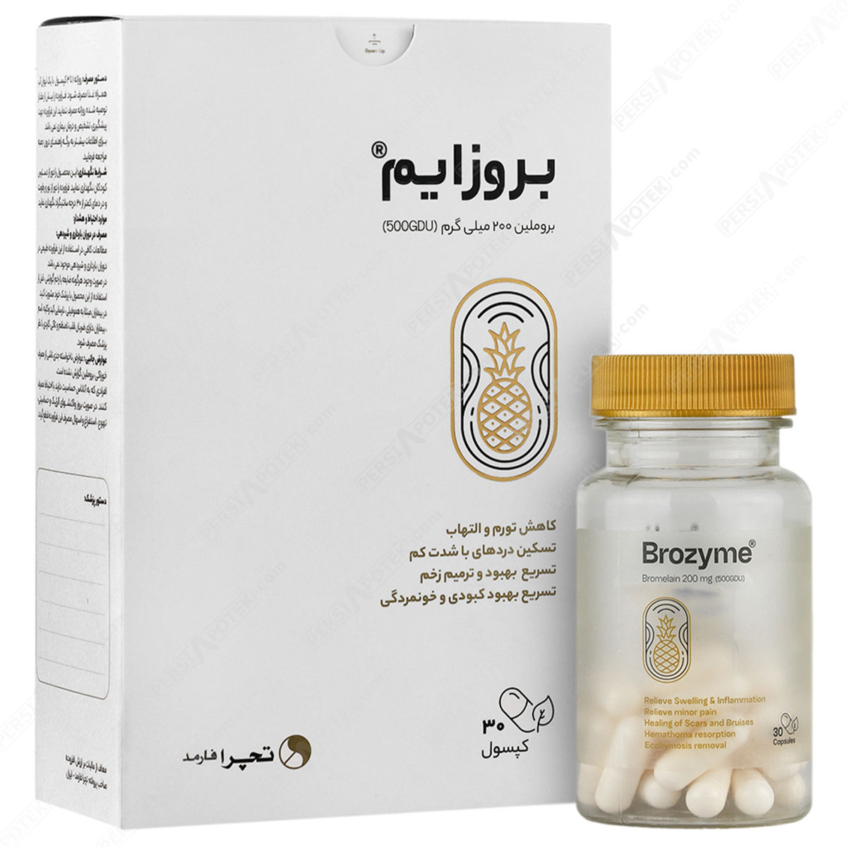 کپسول بروزایم تچرا فارمد حاوی 200 میلی گرم ماده موثره بروملین بوده که در کاهش التهاب و درد ناشی از آن بسیار موثر عمل میکند. بروملین موجود در قرص بروزایم، ترکیبی از آنزیمهای پروتئولیتیک است که از گیاه آناناس استخراج میشود. اثرات پروتئولیتیک این فرآورده در معده و روده باریک به هضم پروتئینها کمک میکند. این ماده به صورت انتخابی و غیر مستقیم با مهار بیوسنتز پروستا گلاندینهای پیش التهابی عمل میکند. پروتئازهای داخلی که سطح پروستاگلاندین را در پاسخ به ضربه یا استرس طولانی مدت افزایش میدهند، توسط بروملین مهار میشوند و در نتیجه التهاب کاهش مییابد. این ماده همچنین باعث مهار COX ll و برادی کینین میشود و از این طریق نیز باعث کاهش درد و التهاب میشوند. میتوان گفت این محصول یک قرص ضد التهاب قوی است.